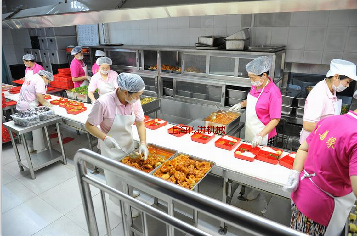 廚房蒸熟的米飯被裝到食品級(jí)塑料筐中。配餐阿姨們?cè)偈謩?dòng)將飯裝入每一個(gè)快餐盒中??雌饋?lái)很簡(jiǎn)單,但是效率并不高,現(xiàn)在大多大型廚房提高效率,添加配菜流水線,傳進(jìn)牌配餐輸送機(jī)也是市場(chǎng)常用的選型廠家。
