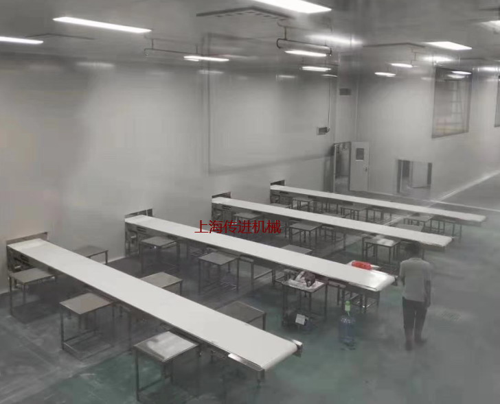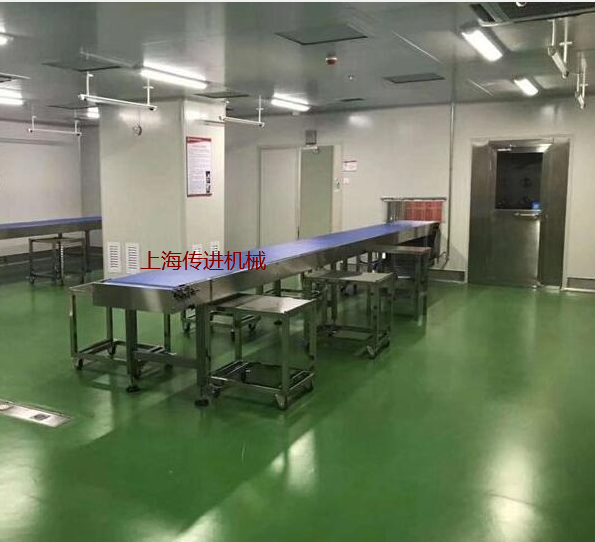 2.傳進配餐輸送機使用的輸送帶是食品級PU的傳送帶,符合國家衛(wèi)生部門的要求.有白色和蘭色兩種顏色可選;