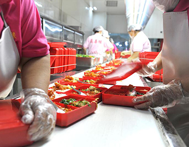 標準化配餐流水線生產(chǎn)—中央廚房配備大型配餐流水線作業(yè)設(shè)備,配餐包裝流程順暢,