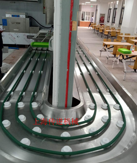 傳進(jìn)餐盤輸送機(jī)巧妙的解決員工食堂餐具回收難題;
