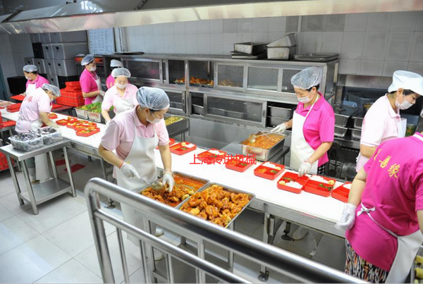 廚房蒸熟的米飯被裝到食品級塑料筐中。配餐阿姨們再手動將飯裝入每一個快餐盒中??雌饋砗芎唵?,但是效率并不高,現(xiàn)在大多大型廚房提高效率,添加配菜流水線,傳進(jìn)牌配餐輸送機(jī)也是市場常用的選型廠家。